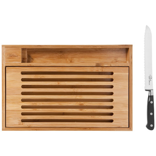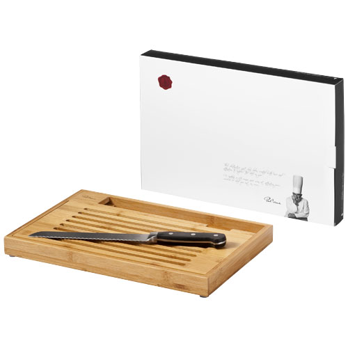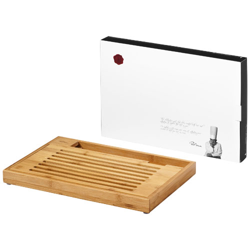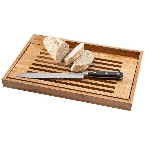 Deska do krojenia wraz z nożem do pieczywa. Deska do krojenia z nożem do pieczywa w zestawie. Poziome wyżłobienia sprawią, że okruchy z pieczywa spadną na poziom niżej zapewniając czystość i komfort krojenia. Zestaw zapakowany w pudełko upominkowe Paul Bocuse. Wzór zastrzeżony. Bambus, stal nierdzewna oraz ABS.