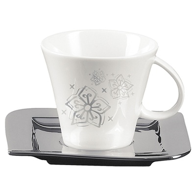 Metaliczny spodek idealnie współgra z klasycznymi kształtami tej filiżanki. Średnica spodka 130mm