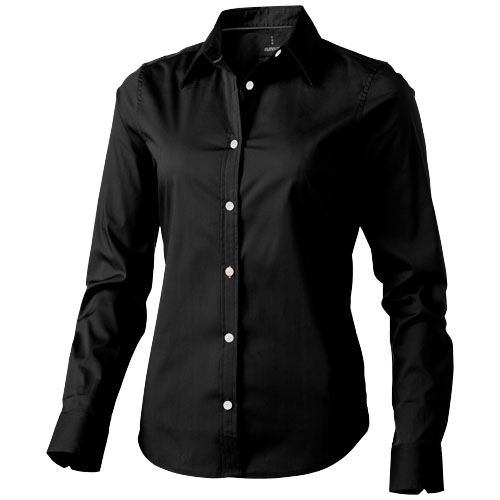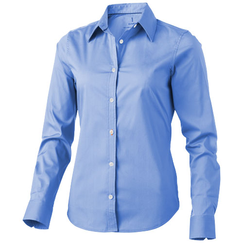 Koszula damska Hamilton. Białe guziki z logo Elevate. Druga dziurka od guzika obszyta pomarańczową nicią. Mankiety z dwoma guzikami by dopasować rozmiar. Rozcięcie w rękawach zamykane na guzik. Logo nadrukowane na plecach w kolorze materiału. Satynowa lamówka wewnątrz na karku. Popelina 100% bawełny, 45x40, 142x92. 130 g/m²