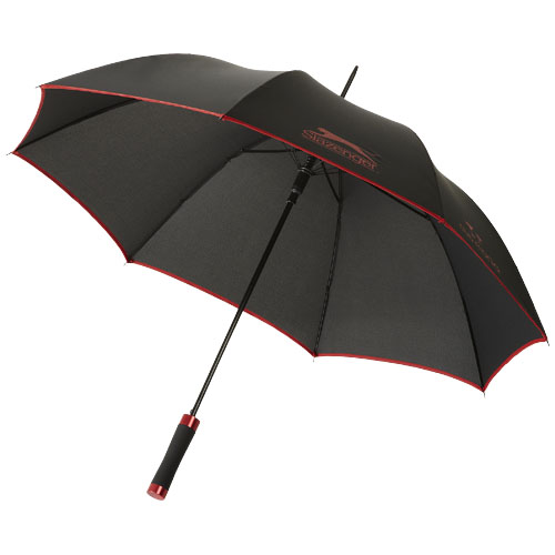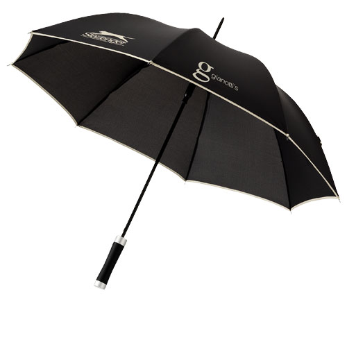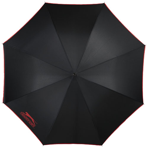 Parasol automatyczny 23''. Objęty wzorem zastrzeżonym parasol z metalowym trzpieniem i szkieletem. Rączka pokryta czarną gumą z dopasowanymi kolorystycznie detalami, zapakowany w etui Slazenger. Poliester.