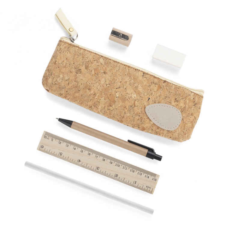 Piórnik z wyposażeniem FUTURE to zgrabna i poręczna wersja etui, zawierającego podstawowe przybory biurowe, które również wykonane są w minimalistycznym designie: długopis, ołówek, gumkę, temperówkę i linijkę. Piórnik wykonany jest z korka, co doskonale wpisuje się w ekologiczne trendy.
