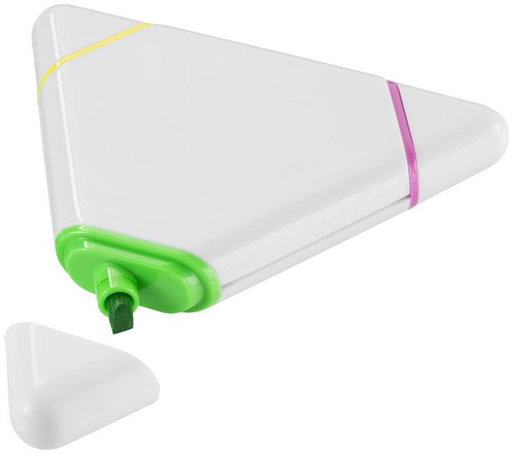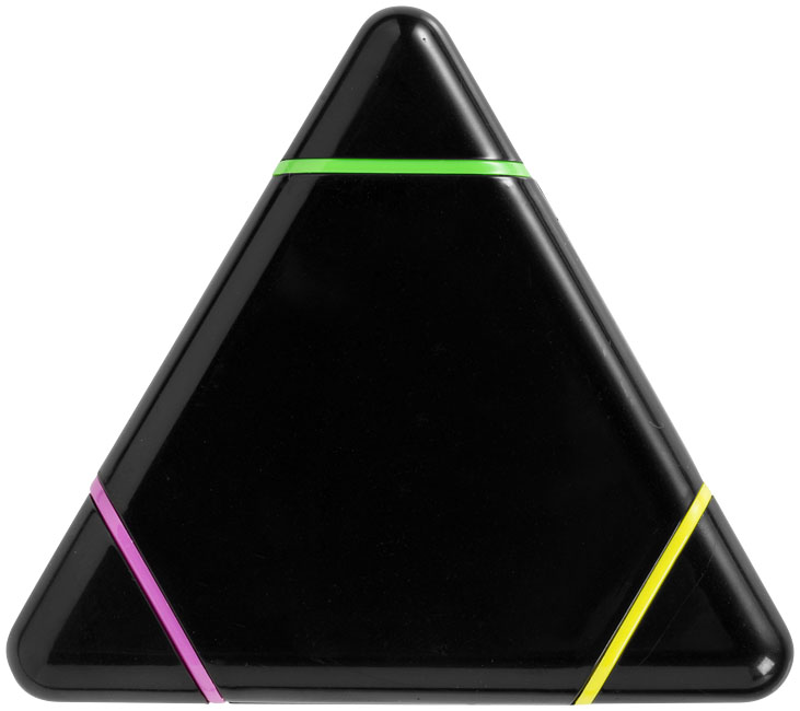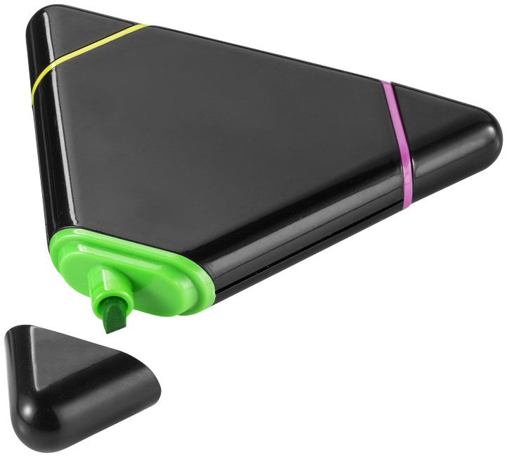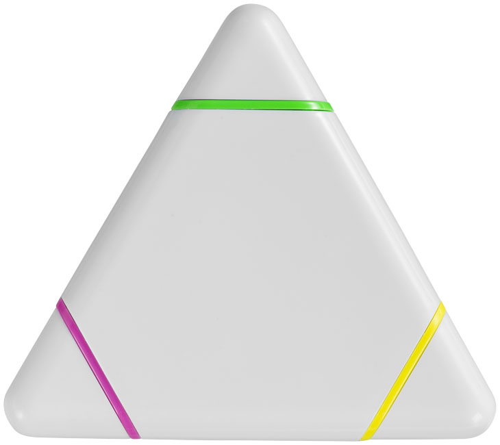 Zakreślacz trójkątny Bermuda triangle. Zakreślacz w kształcie trójkąta z końcówkami ściętymi w kolorach: żółtym, różowym oraz zielonym. Plastik ABS.
